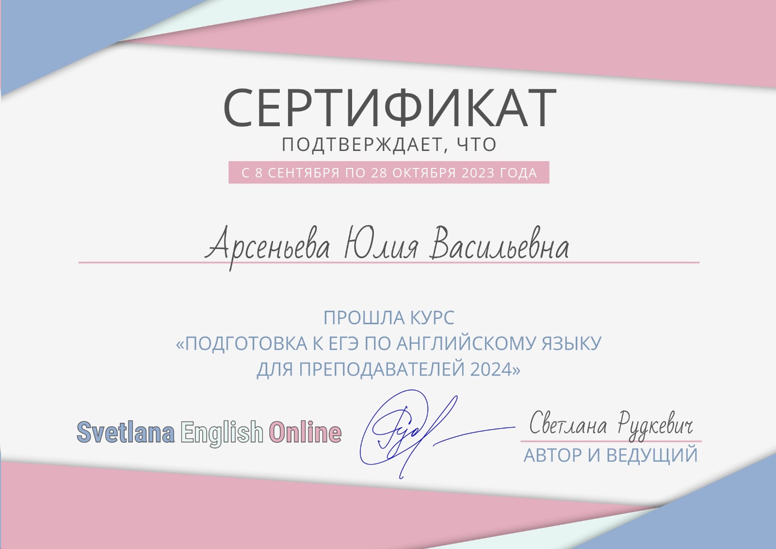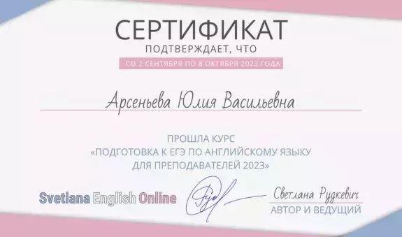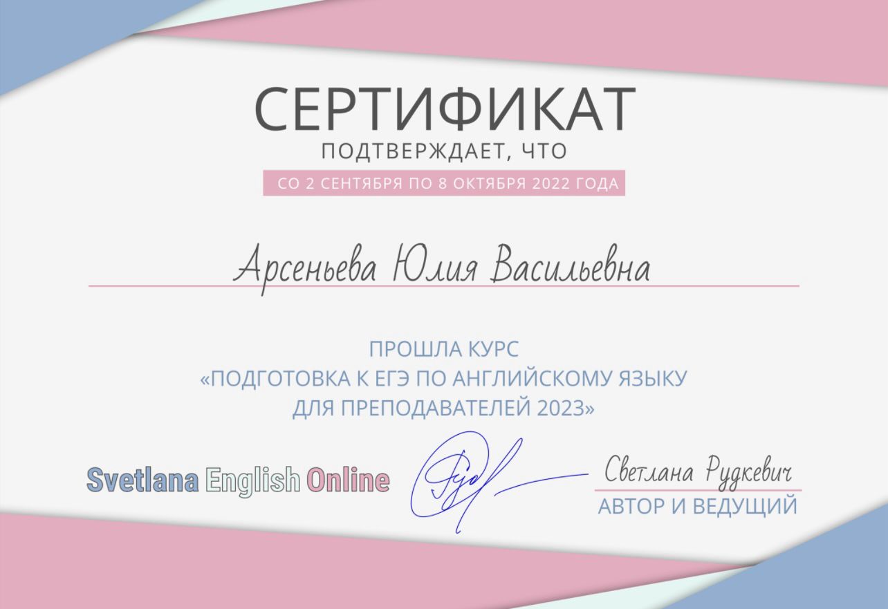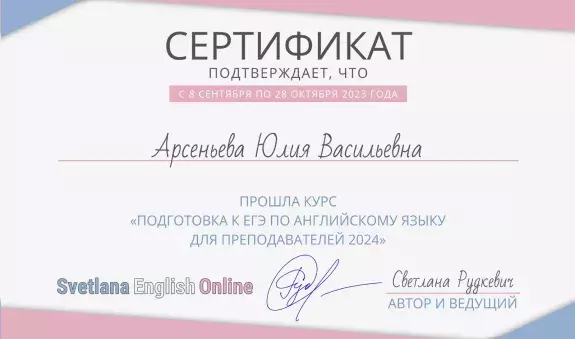 - В 2018, 2022 и 2023 году проходила курс “Подготовка к ЕГЭ по английскому языку для преподавателей 2023”