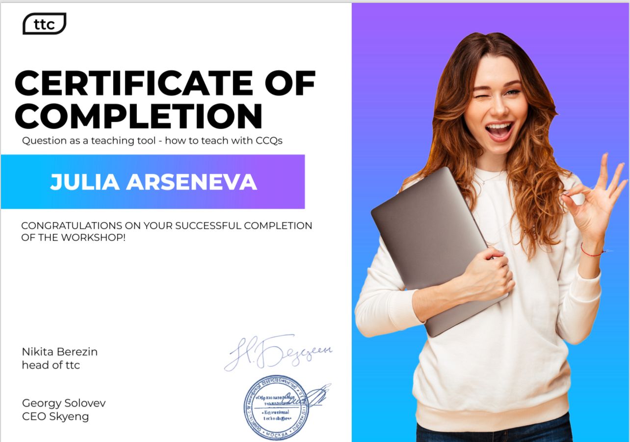 - работала в Skyeng преподавателем Premium и проходила многочисленные курсы повышения квалификации и воркшопы на английском .