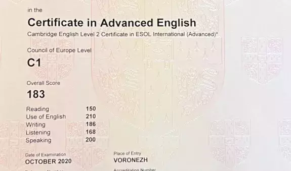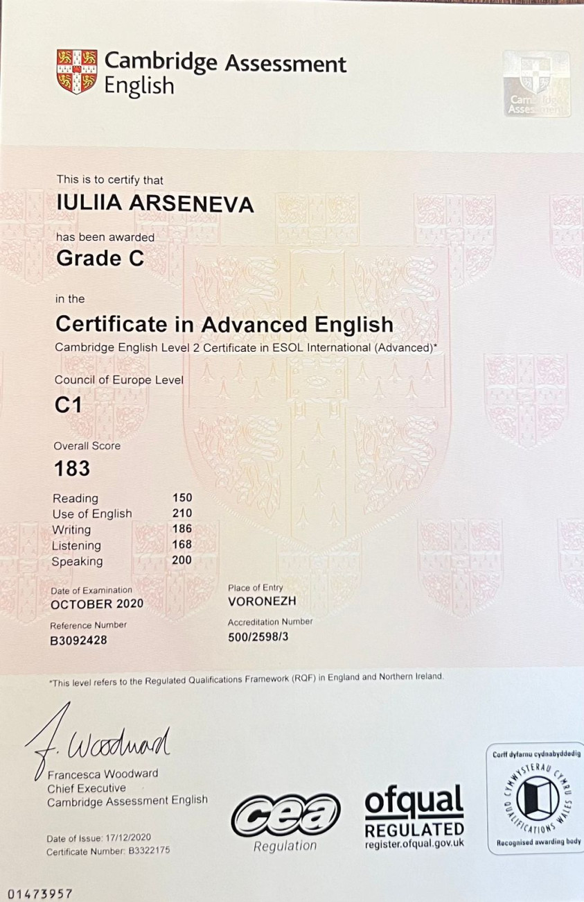 - В 2020 году получила международный Кембриджский сертификат CAE, подтверждающий знание английского языка на продвинутом уровне.